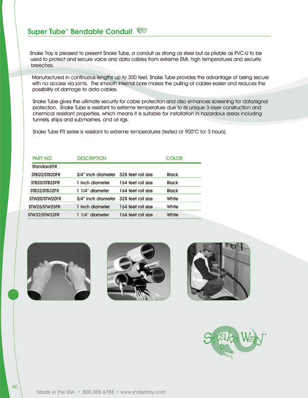 Snake tube is a specially designed innerduct as strong as steel but as flexible as PVC-See Picture below. Snake Tube comes in 300 foot lenghts and can be used for fire protection for control cables and communications systems that are needed to save kives in case of a fire emergency. Snake Tube has been rated to withstand 900 degree of celsius fire for up to 3 hours. We have this product in stock and ready to ship.